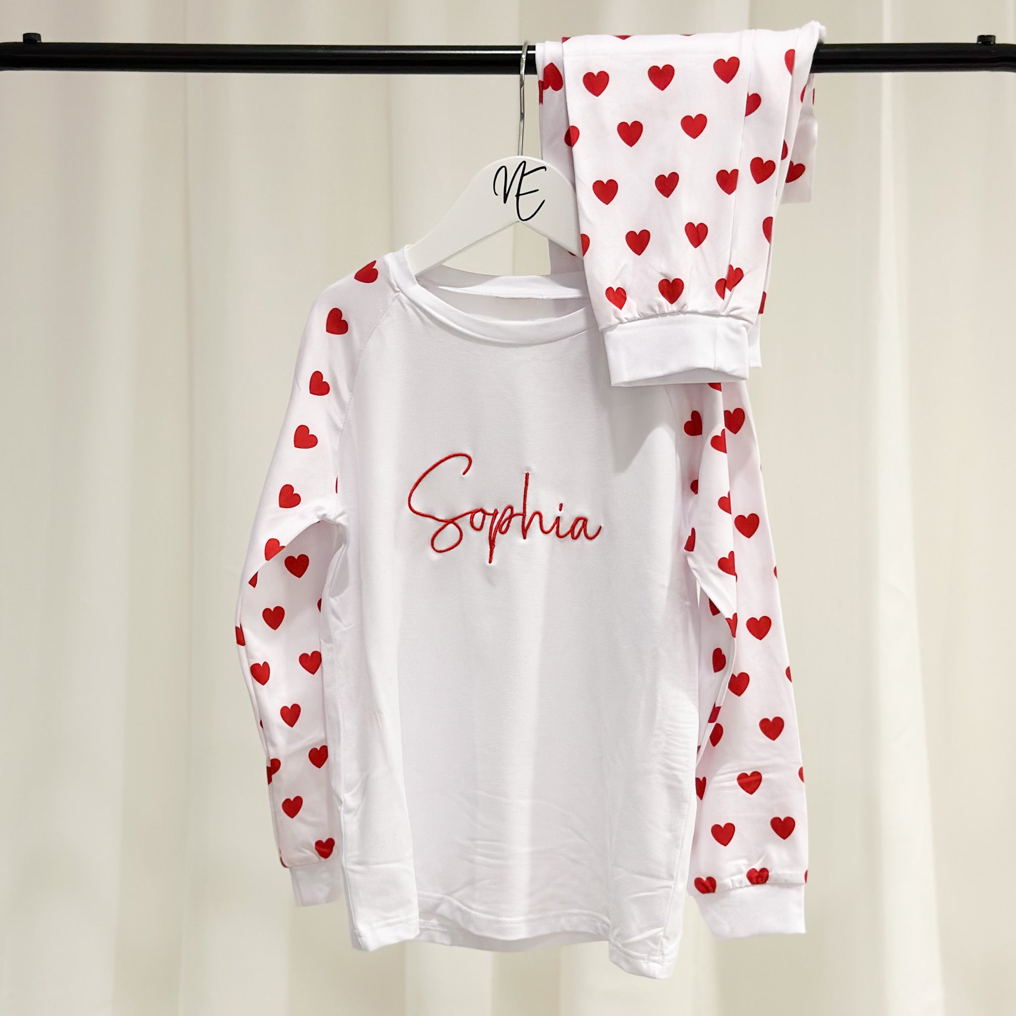The pyjamas feature red love hearts on the sleeves with a white body and matching love heart bottoms, the perfect colour combination for February 14th. Embroidery is a stunning bright red.